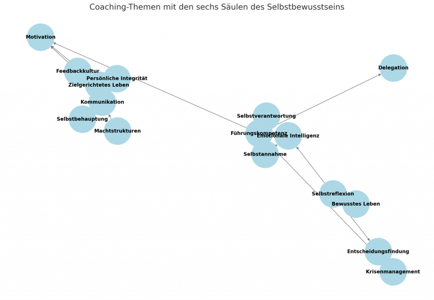Im Beispiel sehen wir einen Content-Graphen, der auf den „6 Säulen des Selbstwertgefühls“ von Nathaniel Branden basiert. Wir werden in Zukunft Benchmarks von Coaching-KIs sehen, welche die Variablen Usability, Personalisierung, Coaching-Graph und Use Cases untersuchen.