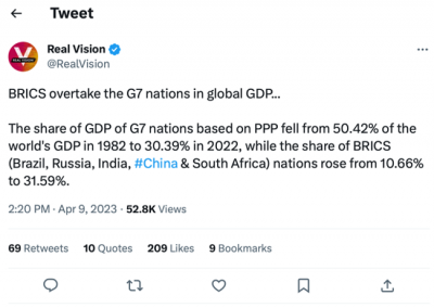 The BRIC countries account for 32% of GDP, while the G7 accounts for only 31%.